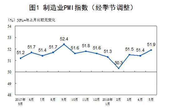 2018年5月份,中国制造业采购经理指数(PMI)为51.9%,高于上月0.5个百分点,制造业总体扩张有所加快。