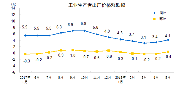 2018年5月份,全国工业生产者出厂价格同比上涨4.1%,环比上涨0.4%。工业生产者购进价格同比上涨4.3%,环比上涨0.3%。1-5月平均,工业生产者出厂价格比去年同期上涨3.7%,工业生产者购进价格上涨4.2%。