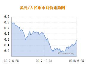 金融界外汇6月26日讯 今日人民币兑美元中间价报6.5180元,较上一交易日(6月25日)的6.4893元下调287个基点,连续五日调贬,再创逾五个月以来新低。