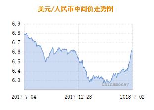 金融界外汇7月3日讯 今日人民币兑美元中间价报6.6497元,较上一交易日(7月2日)的6.6166元下调340个基点。