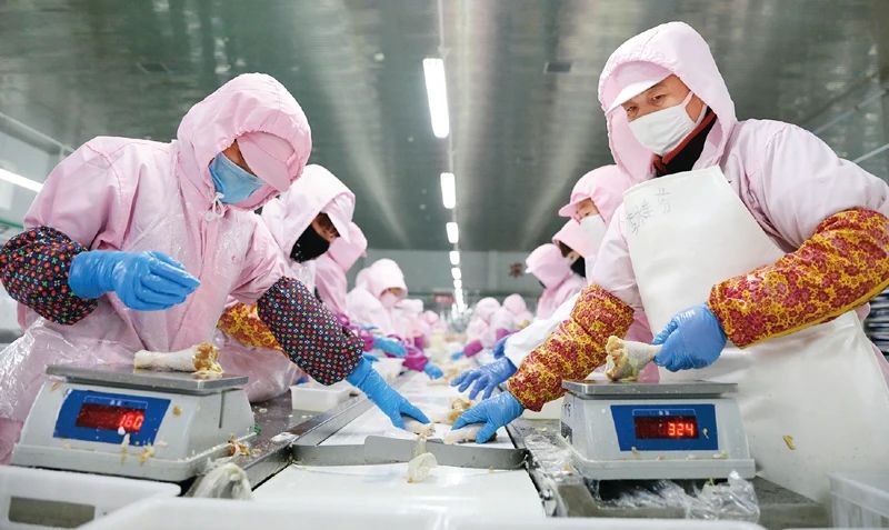 图注:解决好中小微企业复工复产中面临的融资问题,不仅是一个重要的经济金融问题,更是一个重要的就业和民生问题。辽宁鞍山银行等金融机构通过一系列“春风行动”,为企业复工复产提供金融支持。图为2020年3月9日,在鞍山星奥肉禽有限公司生产车间,工作人员在流水线上分拣鸡腿。新华社记者 姚剑锋/摄