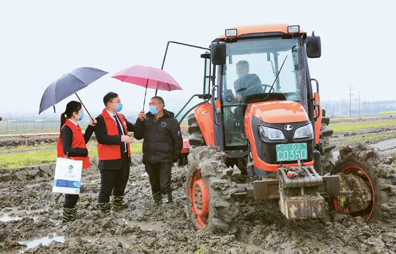 图注:新冠肺炎疫情让今年的春耕形势备受考验。不少银行推出各项支农惠农举措,开足马力支持春耕备耕。图为2020年3月6日,浙江一家农商银行客户经理在田间地头为农户提供金融服务。中国银行保险报供图 蒋加平/摄