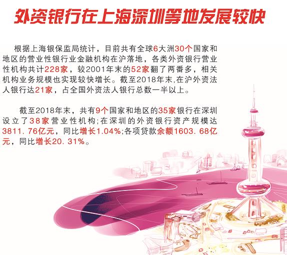 纵观当下我国金融业对外开放进程,银行业相关领域正快速推开。外资银行在上海、深圳等地区布局较广、增长较快。根据上海银保监局统计,目前共有全球6大洲30个国家和地区的营业性银行业金融机构在沪落地,各类外资银行营业性机构共计228家,较2001年末的52家翻了两番多,相关机构业务规模也实现较快增长。截至2018年末,外资法人银行达21家,占外资法人银行总数一半以上。同时,地理位置毗邻香港和粤港澳大湾区的实施,使得深圳成为外资在华布局的重点。截至2018年末,共有9个国家和地区的35家银行在深圳设立了38家营业性机构;在深圳的外资银行资产规模达3811.76亿元,同比增长1.04%;各项贷款余额1603.68亿元,同比增长20.31%。