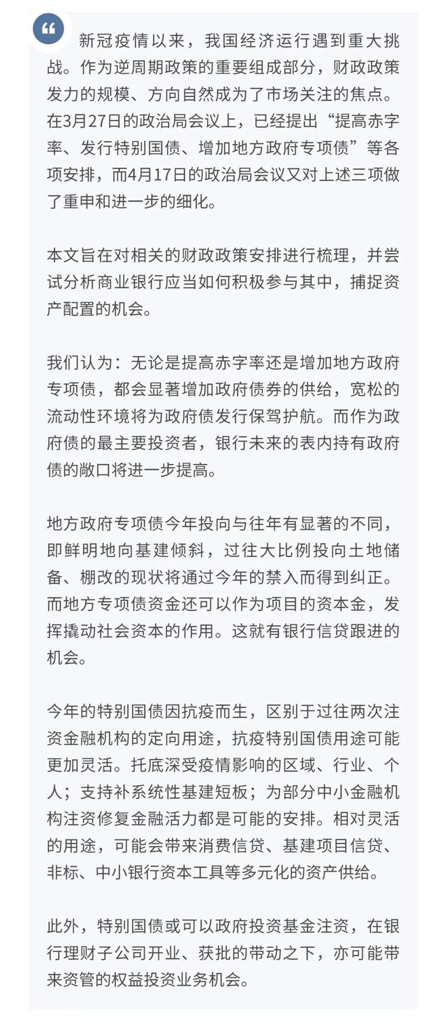 本文旨在对相关的财政政策安排进行梳理,并尝试分析商业银行应当如何积极参与其中,捕捉资产配置的机会。