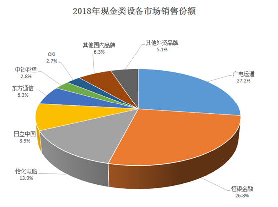 2018年,我国现金类设备市场发展稳定,自主民族品牌厂商广电运通、恒银金融继续保持市场领先地位,仍占据一半以上市场份额,市场集中度进一步提高。御银股份、新达通、神州金信等ATM厂商淡出市场,外资品牌市场份额继续降低,国产厂商引领现金类设备市场的格局继续稳固。