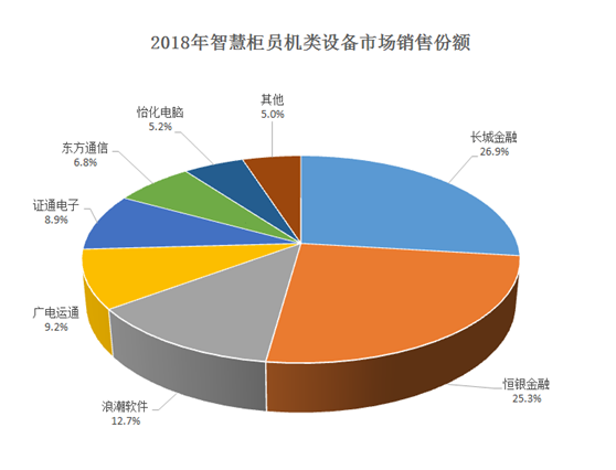 2018年,在国有六大行智慧柜员机采购量稳步增长的基础上,全国性股份制商业银行、城市商业银行、农村商业银行和农村信用社智慧柜员机的采购量均迎来大幅增长。从2018年智慧柜员机类设备市场销售份额来看,长城金融和恒银金融依然保持行业领先地位。