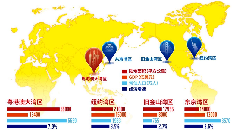 长期以来,无论是综合实力,亦或是经济活力、对外开放水平,粤港澳大湾区毫无悬念地入列国内城市群的第一梯队,与世界其他知名湾区相比也不遑多让。《规划纲要》显示,2017年大湾区经济总量就已达到约10万亿元,总量接近同期的纽约湾区,进出口贸易额是同期东京湾区的3倍以上,大湾区内拥有16家世界500强企业和3万多家国家级高新技术企业。