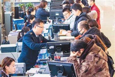 2018年,河北省武邑县税务局积极推行“套餐式”服务,针对涉税事项多、办理周期长的“痛点”,将原来需要多次办理、分别审核的涉税业务整合为“一个套餐”,开设快速通道,进一步压缩流程,优化营商环境。图为12月20日,在位于武邑县政务服务中心的武邑县税务局办税大厅内,工作人员在为客户办理纳税业务。