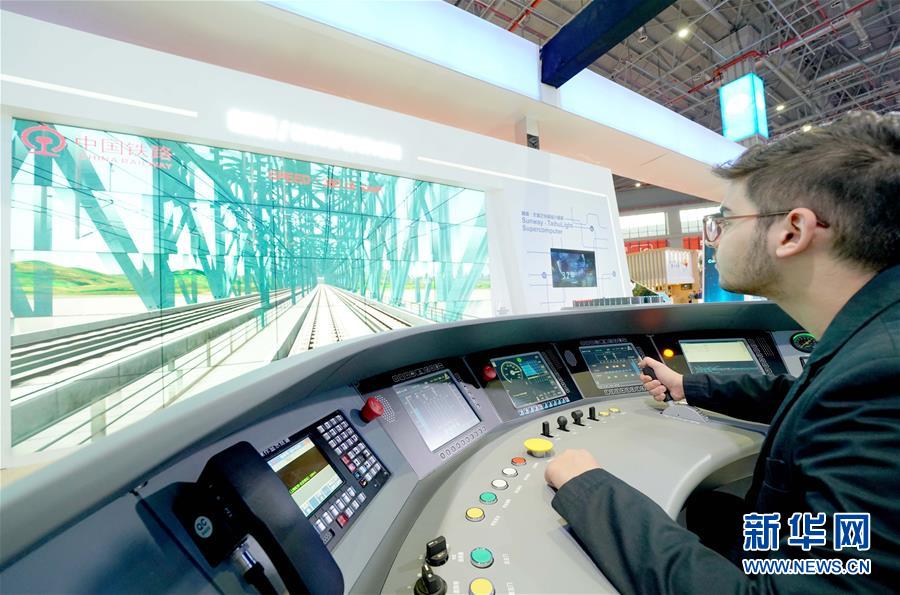 在中国国际进口博览会的国家贸易投资综合展(国家展)上,一名格鲁吉亚政府代表团成员在中国馆内体验驾驶高铁(11月5日摄)。新华社记者 陈建力 摄