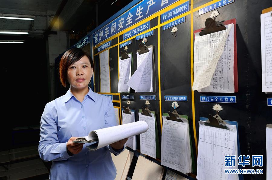 胡小燕在曾经工作过的陶瓷厂检查职工权益保护工作(2013年11月5日摄)。2008年1月,在广东佛山一家陶瓷建材企业打工的胡小燕在有3000多万农民工的广东省高票当选,成为首位农民工全国人大代表。 新华社记者 刘大伟 摄