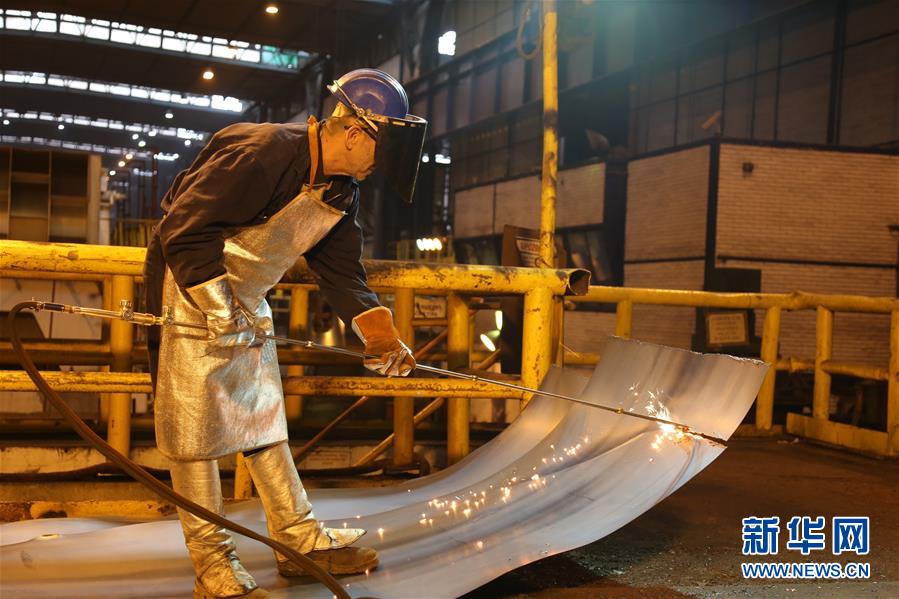 在塞尔维亚河钢(塞尔维亚)钢铁有限公司的厂区内,一名工人在切割钢板(2017年2月21日摄)。 新华社记者 王慧娟 摄