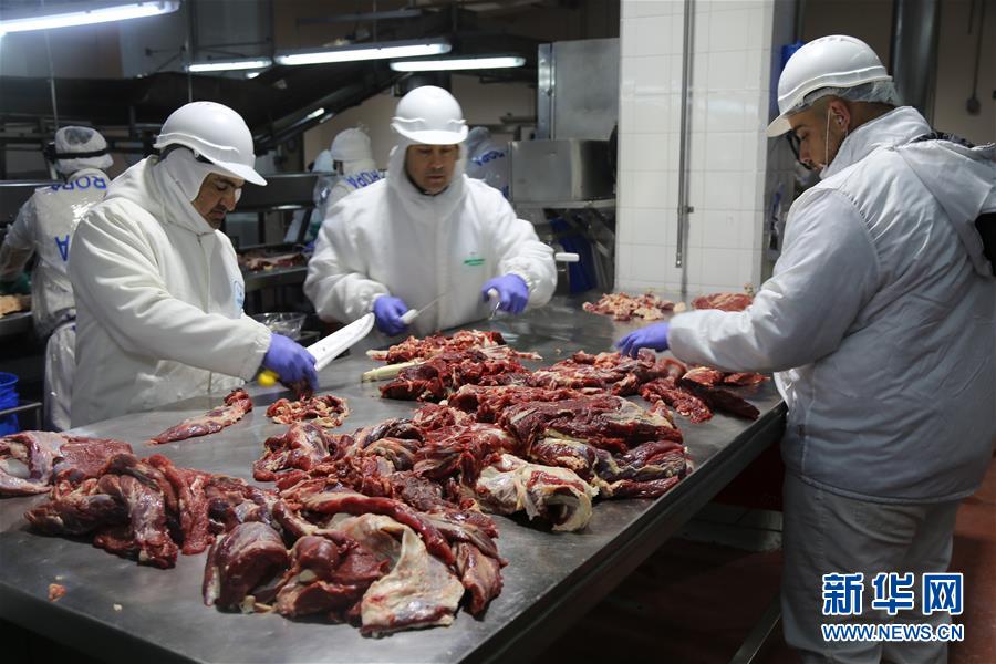 在阿根廷休斯,牛肉加工厂工人在分割牛肉(6月12日摄)。这家工厂是中国企业新大洲的战略合作伙伴,每天屠宰500至700头牛,牛肉主要出口到中国。 新华社记者 倪瑞捷 摄