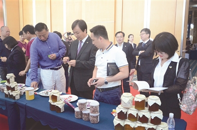 长城国瑞证券卅周年庆暨“新征程”启动仪式参会嘉宾驻足对口扶贫县特产展区。