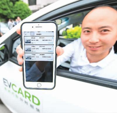 一名技术人员在演示通过“E+租车”APP找到附近可以使用的分时租赁电动汽车信息。