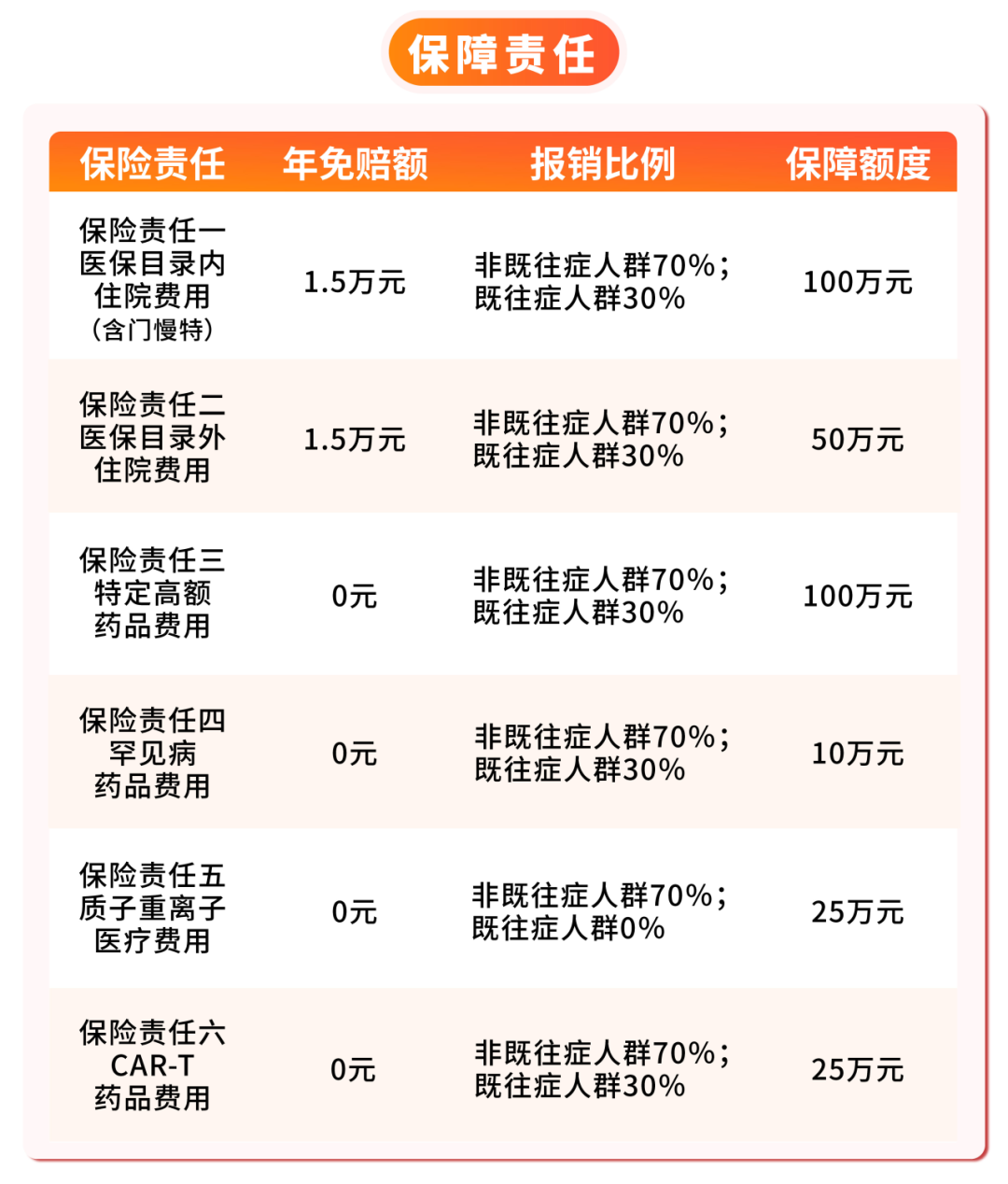 保障覆盖医保目录内、外住院医疗费用,纳入质子重离子保障和4种CAR-T药品保障,减轻重疾医疗费用负担。