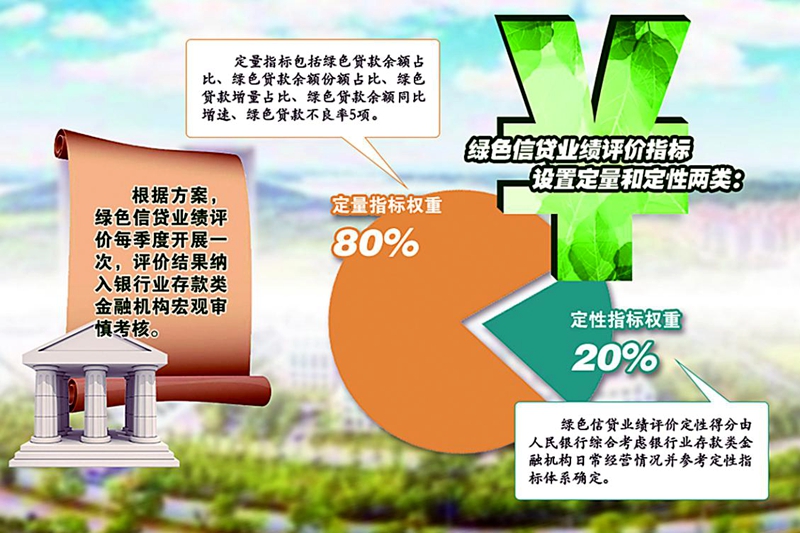 根据方案,绿色信贷业绩评价每季度开展一次。绿色信贷业绩评价指标设置定量和定性两类,其中,定量指标权重80%,定性指标权重20%。后期,人民银行将根据条件变化,酌情调整指标权重。其中,绿色信贷业绩评价定量指标包括绿色贷款余额占比、 绿色贷款余额份额占比、绿色贷款增量占比、绿色贷款余额同比增速、绿色贷款不良率5项。绿色信贷业绩评价定性得分由人民银行综合考虑银行业存款类金融机构日常经营情况并参考定性指标体系确定。绿色信贷业绩评价结果纳入银行业存款类金融机构宏观审慎考核。