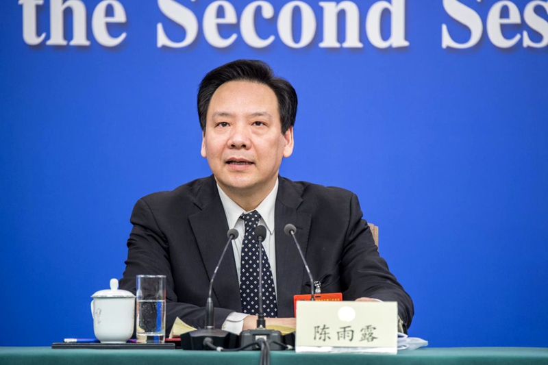 图为全国政协经济委员会副主任、中国人民银行副行长陈雨露在全国政协十三届二次会议第一场记者会上回答记者提问。(本报记者刘志良摄)