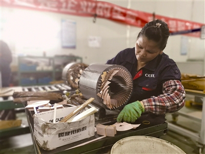 2017年,亚南电机和时代新能源联合成立了宁德时代电机股份有限公司,专门为新能源汽车配套生产多规格、高品质永磁电机。这期间宁德市银行业金融机构积极介入,主动对接融资需求,通过技改资金政策、再贴现政策等持续为企业的发展注入资金“活水”。截至2019年5月末,该企业贷款余额251万元,银行承兑汇票余额438.64万元、银行承兑汇票贴现余额66.9万元。图为宁德时代电机生产车间一角。 本报记者 李国辉 摄
