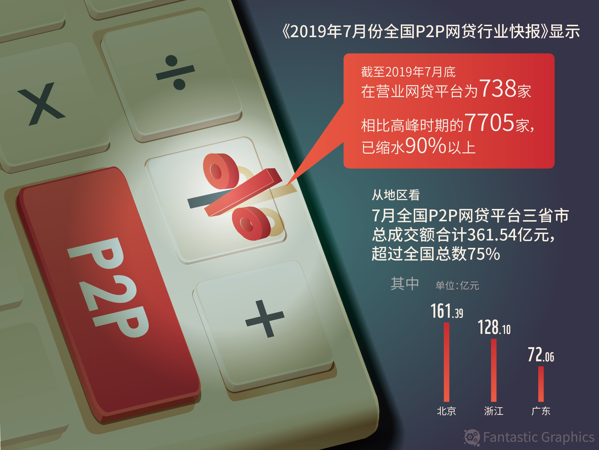 根据某网贷研究机构统计数据,截至2019年7月底,P2P网贷行业正常运营平台数量继续呈现下行态势,总数不及800家,相比6月底减少了30家。从各机构动态来看,消息不断,但是有好有坏:8月份,有网贷公司成功登陆美股,也有上市公司因涉嫌非法吸收存款被立案;有头部平台根据市场环境变化主动转型,也有很多实力不济的中小平台加速离场。