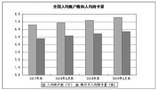 账户和银行卡的普及是民众获得金融服务、消除“金融排斥”的第一步。目前我国人均拥有的银行账户数和持卡量均处于发展中国家领先水平。截至2019年6月末,我国人均拥有7.6个银行账户、持有5.7张银行卡,较2014年末分别提高60%和50%。
