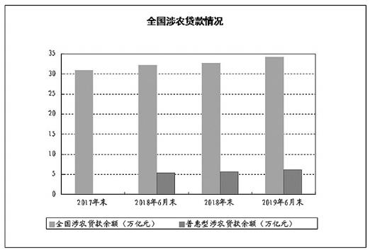 金融支持乡村振兴力度不断加大。截至2019年6月末,全国涉农贷款余额34.24万亿元,其中,农户贷款余额9.86万亿元。普惠型涉农贷款余额6.1万亿元,占全部涉农贷款的17.8%,较年初增长8.24%,高于各项贷款平均增速1.11个百分点。2019年上半年,全国农业保险为1.17亿户次农户提供风险保障约2.57万亿元,为1500.52万户次受灾农户支付赔款203.09亿元。