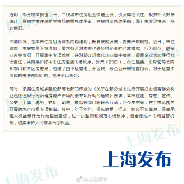 上证报讯 据上海发布微博8月30日消息,近日,上海市住建委、市房管局下发通知,要求各区对上海市代理经租企业的经营模式、行为规范、融资业务等情况,开展集中专项检查,并对部分规模化企业集中抽查,督促企业切实履行社会责任,共同维护好本市住房租赁市场秩序。市住建委、市房管局还会同相部门和各区房管局,组建了四个检查组,分区域、分企业开展检查约谈。对于检查中发现的违法违规问题,坚决予以查处。