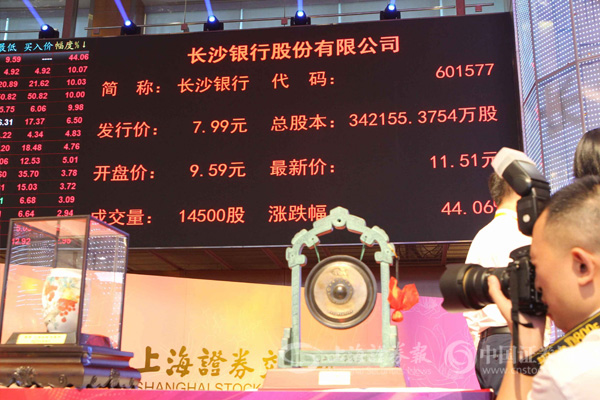 上证报讯 长沙银行今天以9.59元开盘在上交所上市,成为湖南省首家在A股上市的银行、A股第28家上市银行。