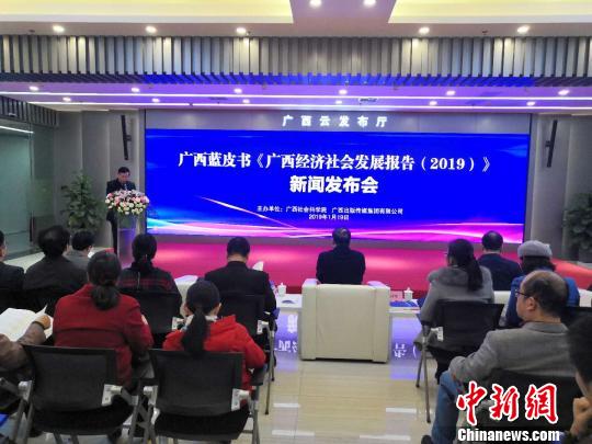 中新网南宁1月19日电 由广西社会科学院主编、广西人民出版社出版的广西蓝皮书《广西经济社会发展报告(2019)》19日上午在南宁正式发布。该书从不同视角展现2018年广西经济社会发展全景与展望2019年发展走向。