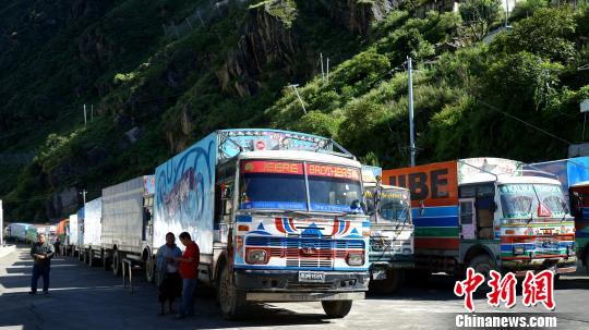 西藏吉隆口岸附近等待通关的尼泊尔货车。(资料图) 江飞波 摄