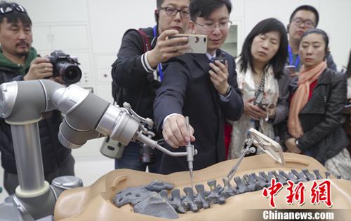 北京以科技创新引领高质量发展,研发出一批具有自主知识产权的技术与全球同步,甚至领先世界。图为北京天智航医疗科技股份有限公司自主研发的手术机器人,能够开展四肢、骨盆以及颈、胸、腰、骶脊柱全节段手术,临床精度达到0.8毫米。 贾天勇 摄