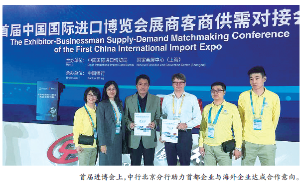 为探索化解中小企业融资难、融资贵这一世界难题,积极服务实体经济,中国银行首创了“中银全球中小企业跨境撮合服务”。中行北京分行充分借助这一互联互通的平台,开展跨境撮合服务,搭建起首都企业“走出去”与全球品牌“引进来”的金融服务之桥,助力在京中小企业走出国门,融入全球资金链、价值链、产业链,壮大自身发展。近年来,中行北京分行已带领300余家小微企业参加中国银行组织的中菲、中意、中欧、东欧、中澳、中葡、金砖国家等网上或现场跨境撮合活动,达成合作意向161项,帮助企业实现贸易、投资、技术引进等一系列商务合作。在去年举办的首届进口博览会上,中行北京分行带领126家首都企业参加展商客商供需对接会,现场与海外客商开展“一对一”洽谈254轮,实现签约53项,成果喜人,切实帮助首都中小企业挖掘了更多商机,赢得了企业广泛好评。