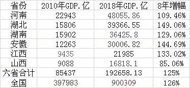 分省份看,6个省之间的分化较为明显。其中,湖北和安徽两省8年经济总量增幅均超过140%,分别为149%和144.69%,江西达到了133%,湖南达到了129%。这四个省份的增速均超过了全国平均水平。