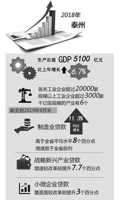 两年多来,泰州紧扣支持产业转型升级和提高金融服务实体经济效率的改革主线,强化组织、全力推进,大胆探索、先行先试,一批全国首创、江苏率先的改革试点项目相继落地,金融支持产业转型升级取得了初步成效。2018年,泰州地区生产总值突破5100亿元,增长6.7%。各类工业企业超过两万家,规模以上工业企业超过3000家,千亿级规模的产业有6个。最新数据显示,截至2019年4月末,泰州制造业贷款同比增长11.3%,高于全省平均水平8个百分点,增速居于全省前列。战略新兴产业贷款增速较改革前提升7.7个百分点。高新技术产业产值占比超过44%,比改革前提升1.5个百分点。小微企业贷款覆盖面较改革前提升3个百分点,信用贷款同比增长38%,高于上年同期30个百分点。