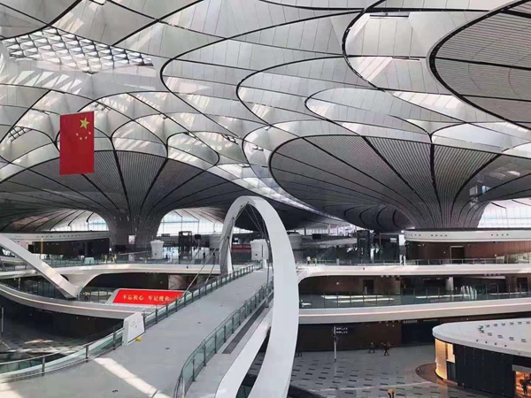 遥望新机场,行云流水般的“扎哈曲线”塑造出惊艳的“凤凰”造型,18万平方米的自由曲面屋面镶嵌着4万块造型不一的金属装饰板,在阳光的照耀下熠熠生辉。
