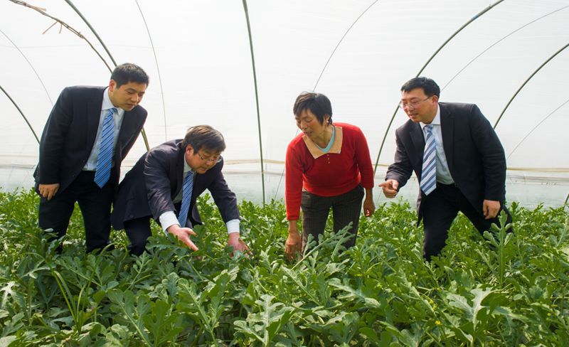 东台西瓜独特的口感深受客户喜爱,已成为地方知名品牌。图为农商银行信贷人员深入农户大棚现场了解西瓜长势。