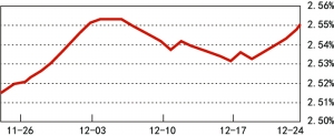 以备受市场关注的天弘余额宝基金为例,其7日年化收益率已从12月15日的2.5360%升至12月24日的2.5510%,呈现微幅上涨态势。