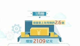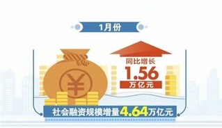 统计还显示,1月份社会融资规模增量为4.64万亿元,比上年同期增长1.56万亿元,其中对实体经济发放的人民币贷款增加3.57万亿元,同比多增8818亿元。