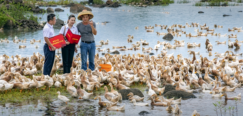 截至今年6月末,邮储银行海南省分行“三农”板块普惠型小微贷款放款逾8亿元。2019年以来,该行通过政策扶持、产业推动、扶贫贷款组合式帮扶,支持农户发展生产,提高经济收入,巩固脱贫成效。图为海南省临高县新盈镇养鸭农户张建军获邮储银行家庭农场贷款支持,养鸭数量已超万只。(符德勇)