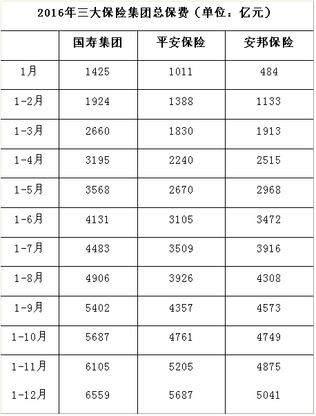 2月22日,保监会发布2016年保险业数据,《每日经济新闻》记者统计发现,以集团总保费而言,行业前三甲座次被完全打乱:安邦保险首次跻身前三,而连续两年屈居平安保险之下的国寿集团,则在2016年卷土重来,夺回总保费冠军。