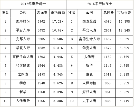 根据保监会最新发布的2016年保险业数据,《每日经济新闻》记者统计发现,人身险公司总保费排名前十位的分别为:中国人寿(5962亿元)、平安人寿(3682亿元)、安邦人寿(3305亿元)、华夏人寿(1832亿元)、富德生命人寿(1703元)、和谐健康(1544亿元)、太保寿险(1498亿元)、泰康人寿(1248亿元)、新华保险(1168亿元)和人保寿险(1166亿元)。