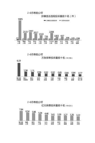 在寿险方面,合同纠纷投诉量居前十位的依次为中国人寿(5905件)、平安人寿(2397件)、太平洋人寿(2208件)、泰康人寿(2133件)、新华人寿(2017件)、人民人寿(1510件)、富德生命(1003件)、太平人寿(937件)、阳光人寿(726件)和华夏人寿(361件)。上半年原保险保费收入前十名的公司基本全部上榜,唯有安邦人寿列39位。
