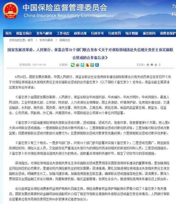 《备忘录》内容涵盖保险领域失信联合惩戒对象、惩戒措施、惩戒方式、信息共享、信息管理等5个方面,核心是6大类28项联合惩戒措施:一是限制联合惩戒对象市场准入;二是限制联合惩戒对象任职资格;三是加强对联合惩戒对象监管;四是限制联合惩戒对象部分消费行为;五是限制联合惩戒对象享受优惠政策;六是限制联合惩戒对象评优表彰。