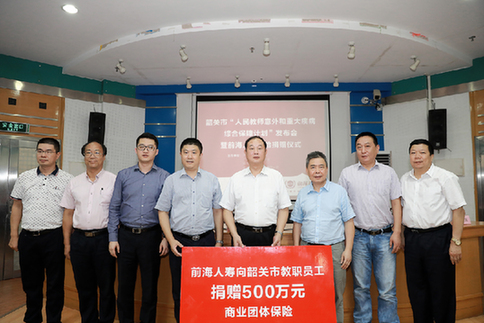 2017年9月8日,在第三十三个教师节来临之际,由广东省扶贫基金会、广东省保险行业协会、韶关市教育局、前海人寿共同主办的“韶关市人民教师意外和重大疾病综合保险保障计划”发布会暨前海人寿保险捐赠仪式,在广东省韶关市北江中学举行。前海人寿通过广东省扶贫基金会的公益平台,向韶关市4万多名教职员工捐赠总保费500万元的教师险,每位教师保额超过200万元。