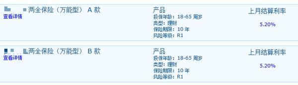 这两款万能险实为一款产品的A款、B款,记者随后获得的产品介绍资料显示,产品为两全保险,保险期间均为10年,交费方式均为趸交。用理财经理的话说,2款产品的最大区别在于“期限”,A款、B款期限分别为“2年、3年”,不过最长均可持有10年。