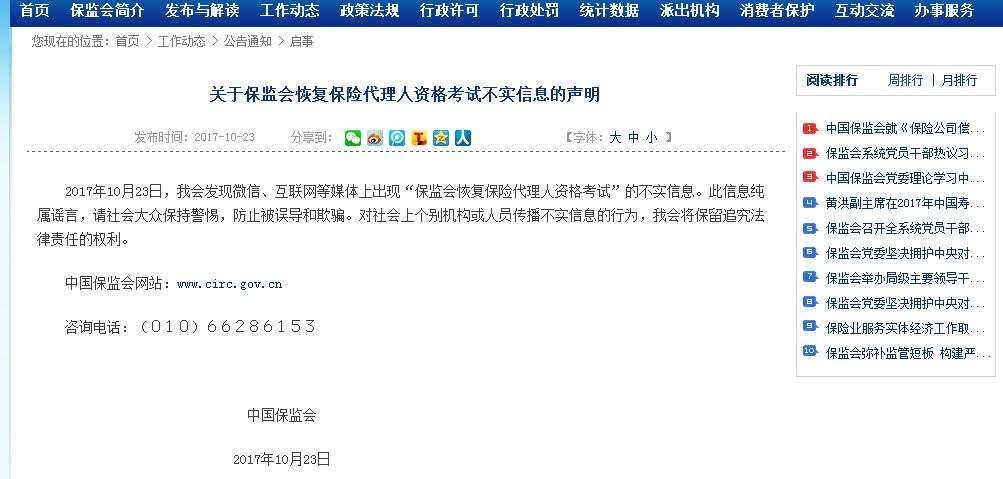 保监会网站消息,保监会10月23日发现微信、互联网等媒体上出现“保监会恢复保险代理人资格考试”的不实信息,此信息纯属谣言。