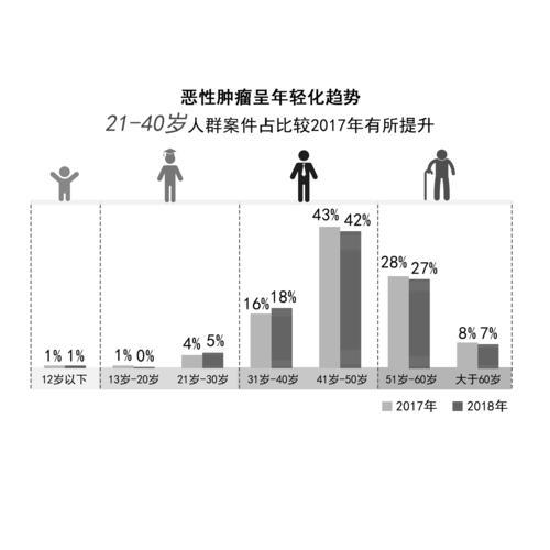 在重大疾病理赔案例中,出险年龄较高的依次为以下三个年龄段:41岁到50岁之间、51岁到60岁之间、31岁到40岁之间。恶性肿瘤理赔案例也出现了年轻化趋势,泰康人寿数据显示,2018年该公司21岁到30岁、31岁到40岁恶性肿瘤理赔案例分别占5%、8%,较2017年分别提升了1%、2%。