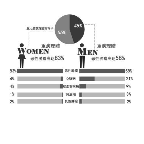 综合多家寿险公司的理赔报告来看,影响中国人寿命的三大杀手依次为恶性肿瘤、心脏病、脑血管病。在因疾病身故的赔付中,恶性肿瘤在七成以上,女性略高于男性;在因意外身故的赔付中,交通事故是头号杀手,基本在两成左右,男性远高于女性。