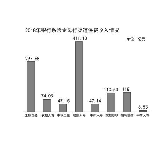 随着银行系险企陆续披露与母行的关联交易报告,其2018年银保渠道保费收入情况也随之浮出水面。在已披露关联交易数据的8家银行系险企中,建信人寿通过建设银行获得代销保费收入约411.13亿元,数额最高。工银安盛通过工商银行获得保费收入为294.68亿元,同比下降19%;农银人寿母行渠道保费降幅超过五成。