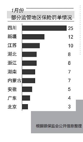 就地区而言,四川银保监局处罚力度最大,累计开具罚单25张,高居罚单榜首,其中保险中介相关罚单达17张。其次是新疆和江苏银保监局,罚单数量分别为12张和10张。罚单量最多的前三地合计罚款金额达730万元。目前2月过半,截至本月18日,当月共开罚单量10张,四川银保监局(含分局)占据了8张。