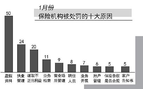 在1月份的罚单中,被处罚的财险公司多于寿险公司。首月共有14家财险公司被罚,罚金合计达719万元,占比38.82%。从处罚原因来看,除罚单较为集中的车险领域外,农险罚单也不在少数。